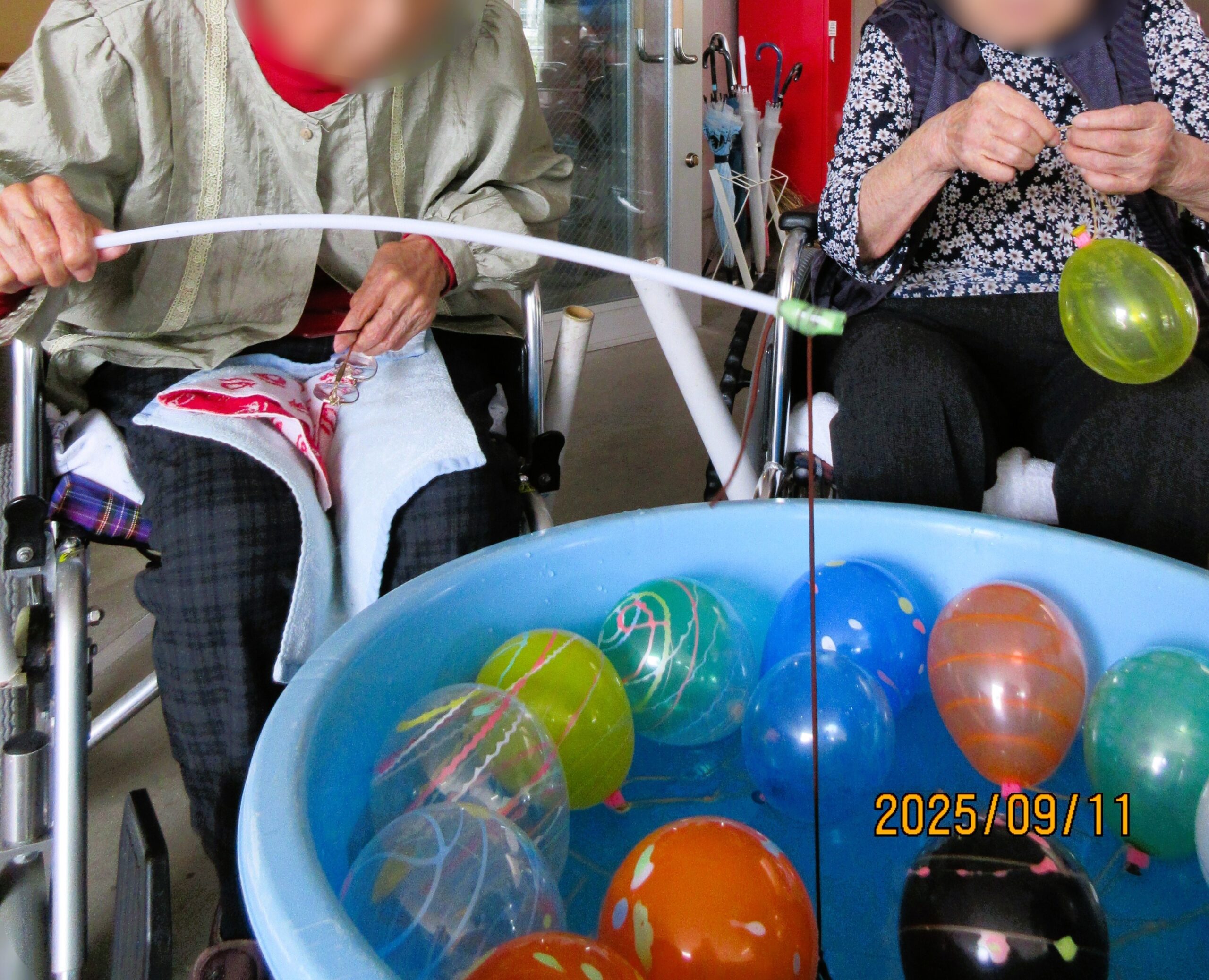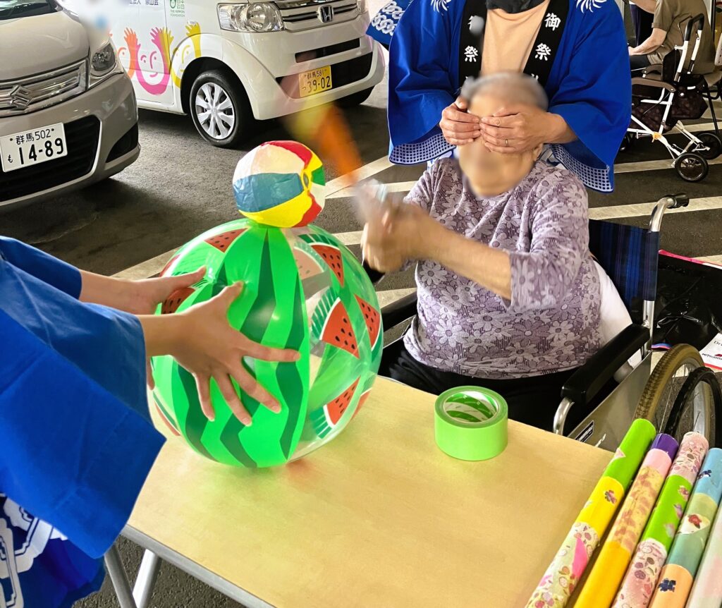 お祭りのゲームはヨーヨー釣り、千本引き、スイカ(紙風船)割りの3種類が登場しました!!ヨーヨー釣りでは、様々な色と模様が用意されていて、それぞれお好きなヨーヨーを選ばれていました😊赤やピンクが人気だったようです🌷千本引きでは何が当たるかドキドキ。色々なお菓子セットが用意されました🍭スイカ割りでは、スイカの上に乗った紙風船を割るのはなかなか難しかったですが、一発で割った方がなんと3人もいらっしゃいました!びっくり🍉✨